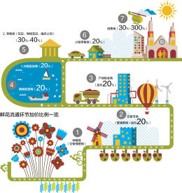 一枝國產(chǎn)紅玫瑰,從種植農戶到消費者手中,需要96個小時,4至5道環(huán)節(jié)。在這個環(huán)節(jié)中,經(jīng)過層層提價,原本單枝種植成本5角的鮮花也攀升至7元的零售價。